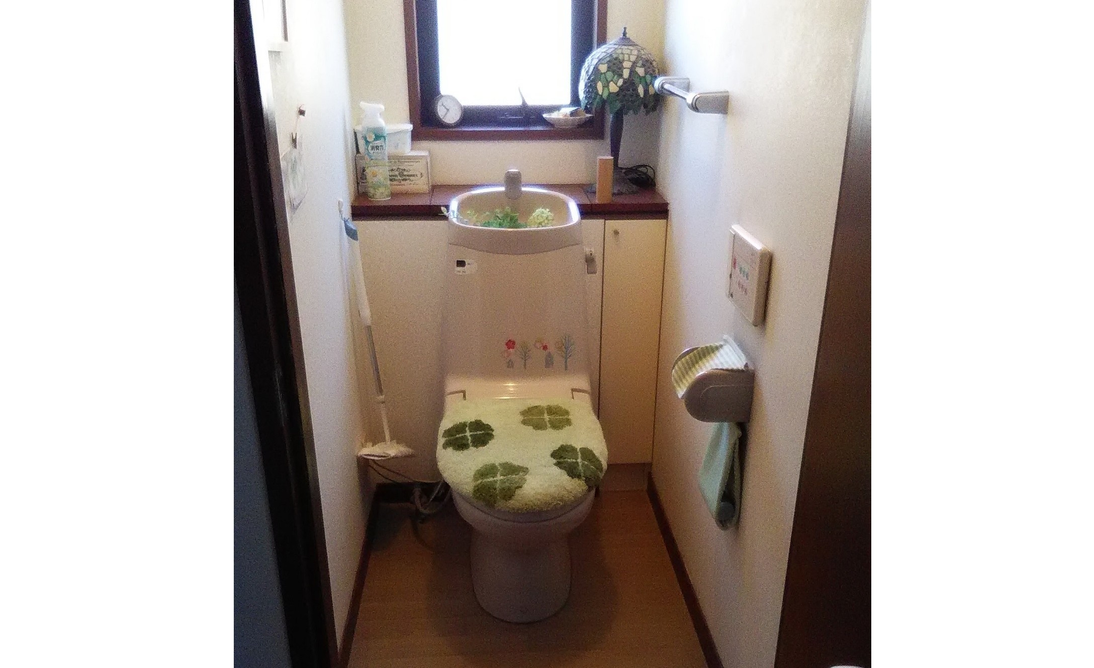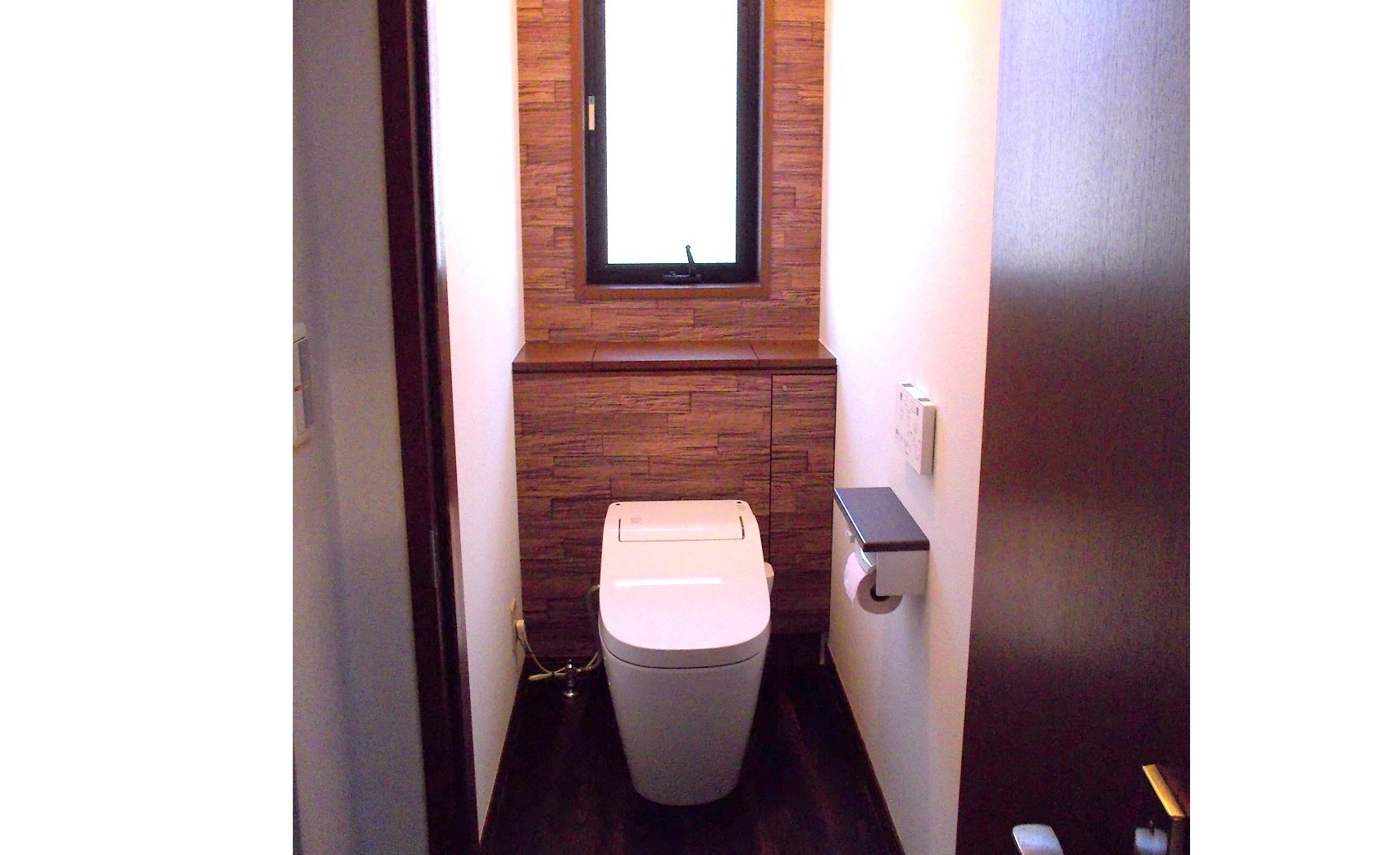 トイレの故障を機にトイレ全体のリフォームへとなりました。 木目調のアクセントクロスがひかる素敵な空間に変身しました!