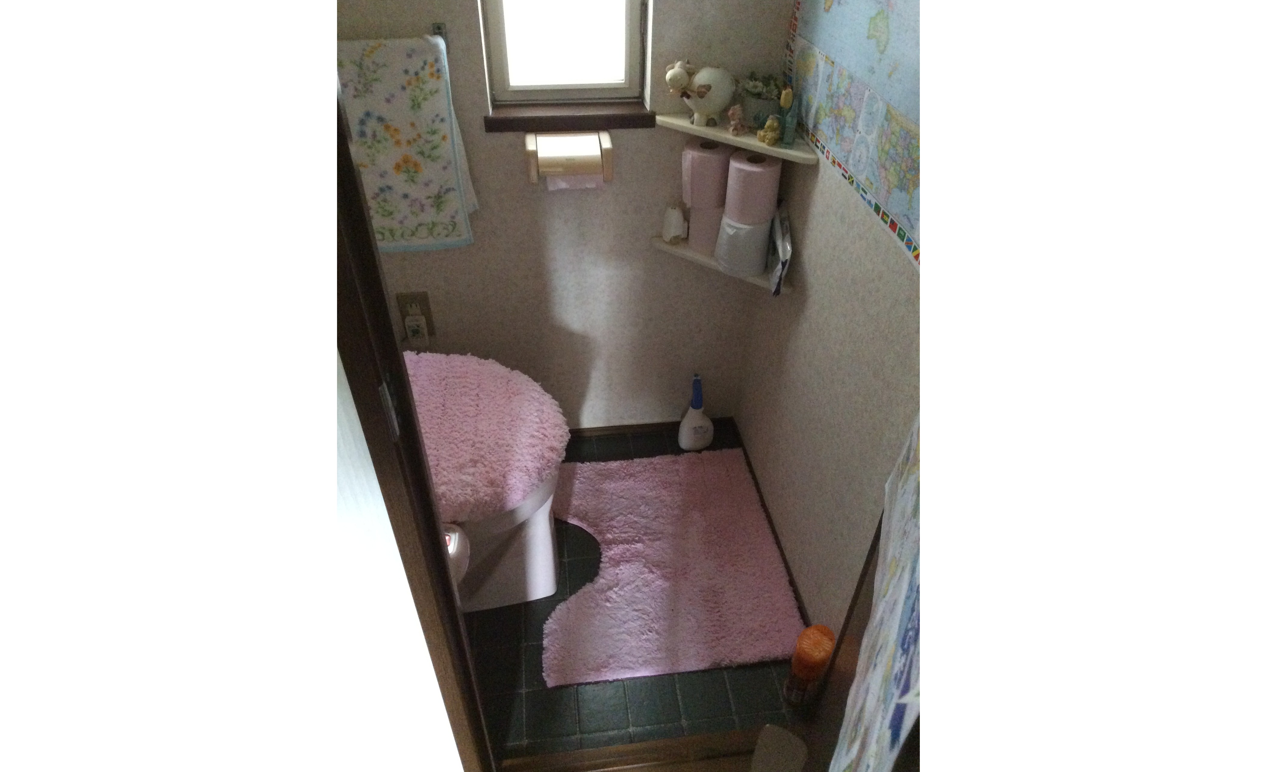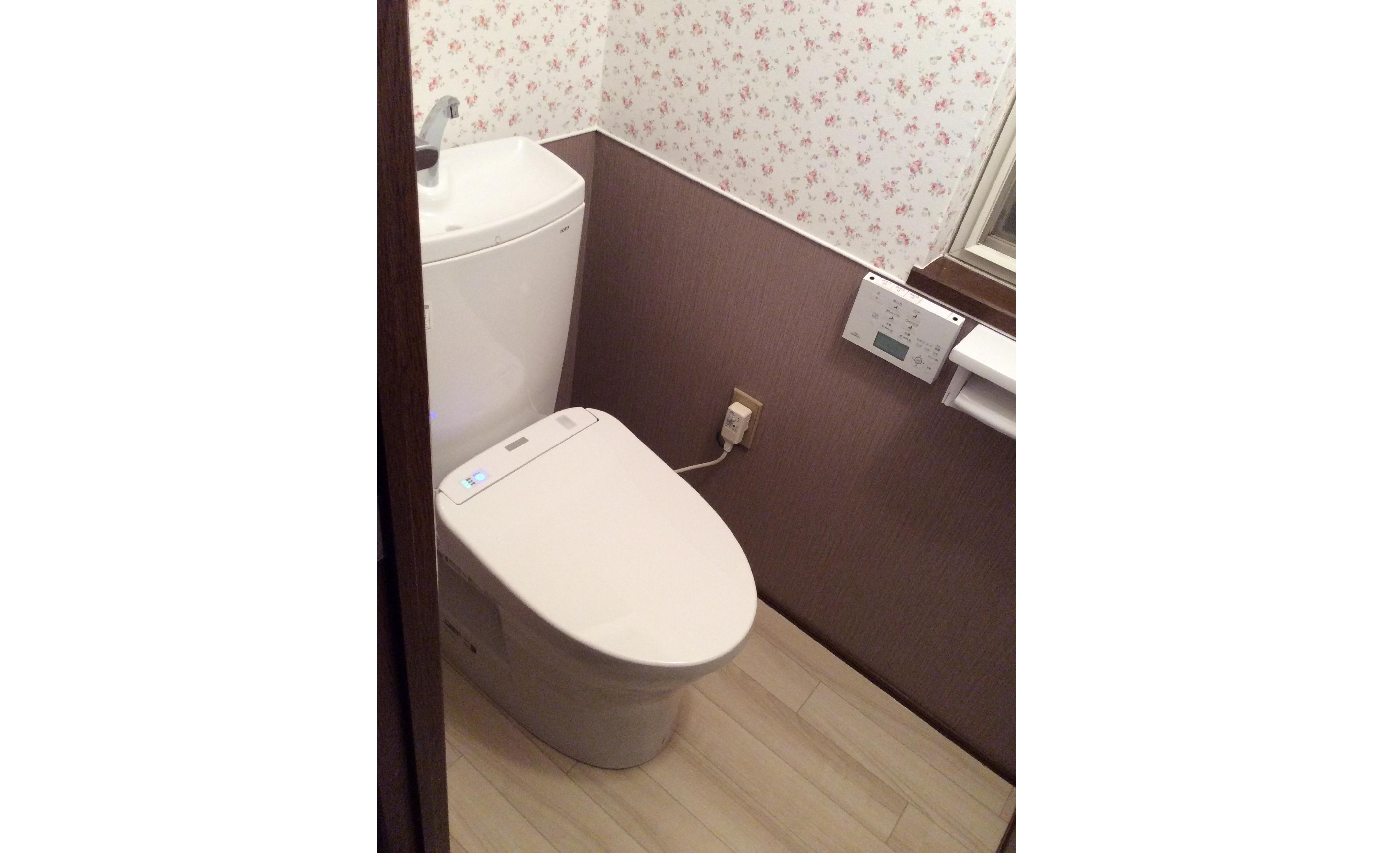 トイレのピンクに合わせて、壁紙も可愛らしくしました。 花柄とこげ茶の組み合わせがとっても可愛いです! 新築のような空間になりました。