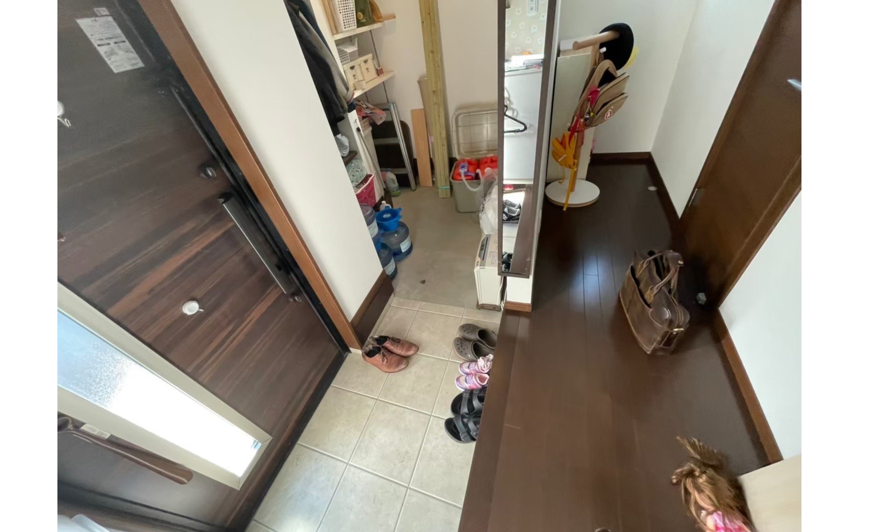 今まで玄関収納が土足で、少しの距離ですが、わざわざ下履に変えるのが面倒でした。 既存の壁を撤去し床を新設することで、内履きのまま収納スペースへ行けるようになりました!
