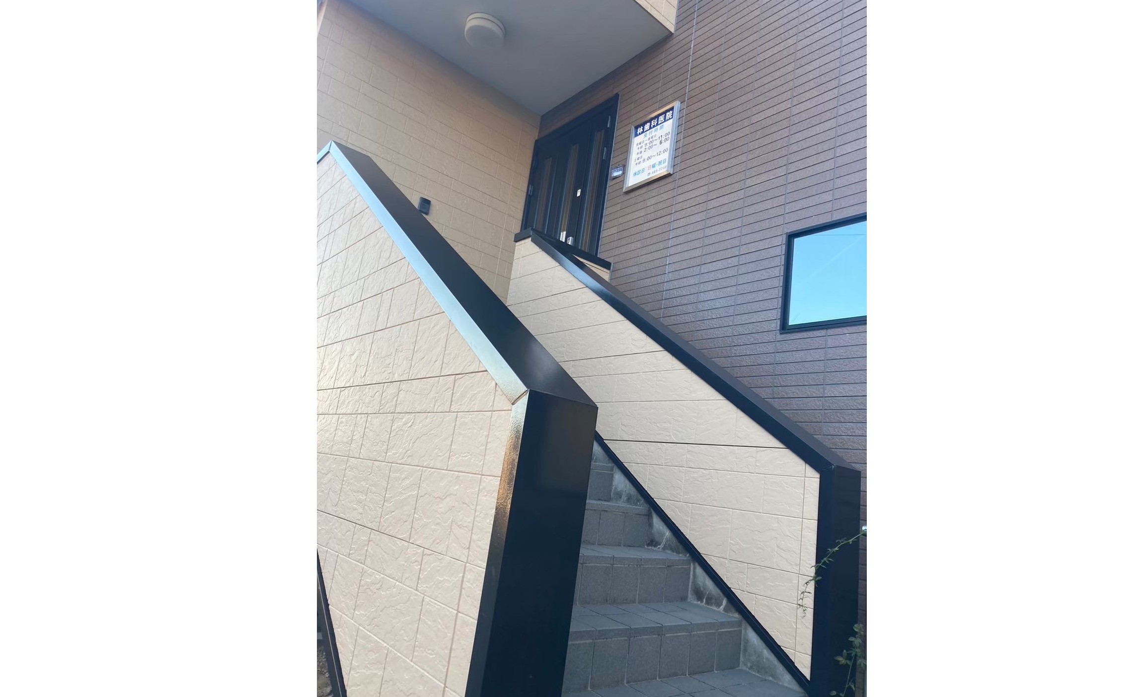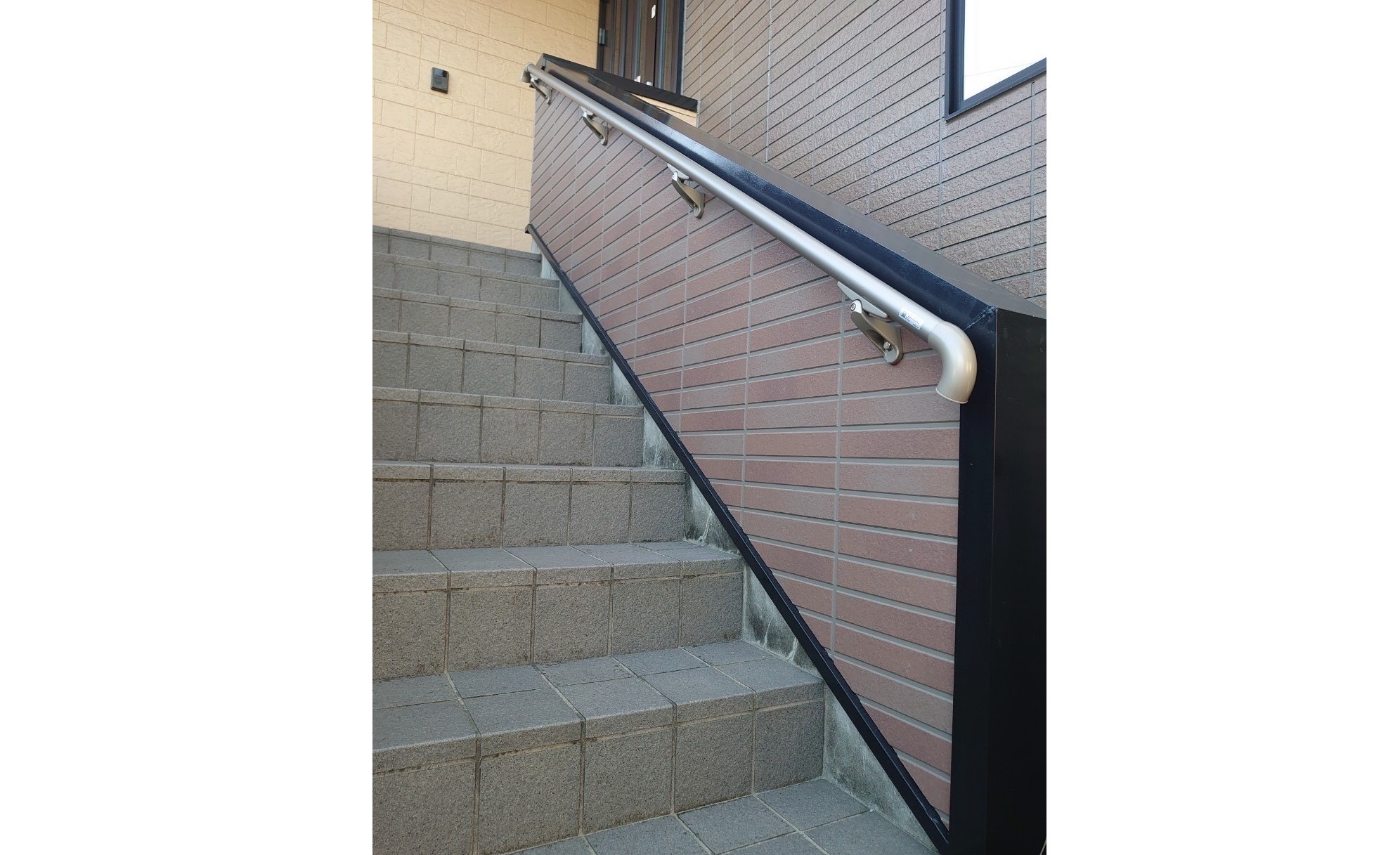 安全に階段を登り降りするために手すりをつけました。外壁材も新しくしましたが、既存の外壁ともとってもも合っています。