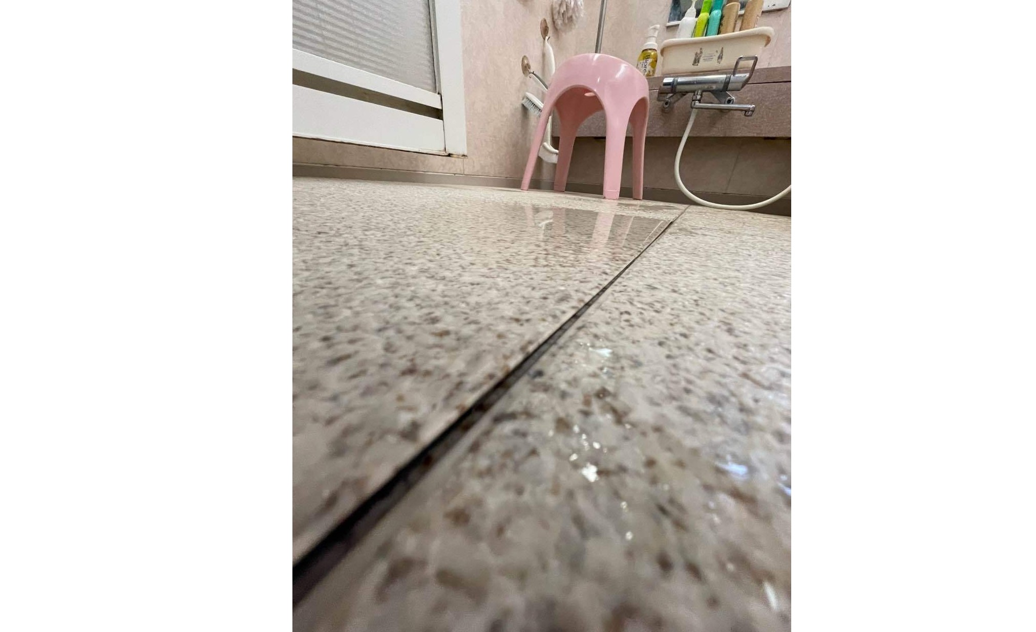 10年以上前に浴室床に貼ったタイルが浮いてきてしまい、水が入り込んでしまっていました。