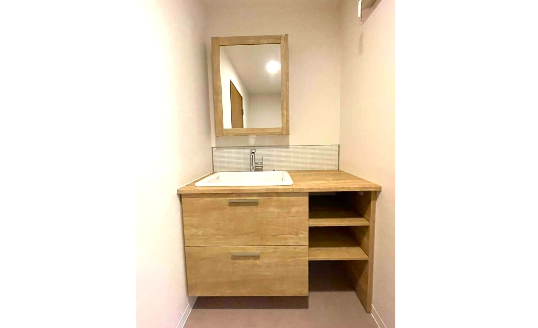 収納も多めに設置し、木目調のおしゃれな洗面へ交換して明るい空間になりました。